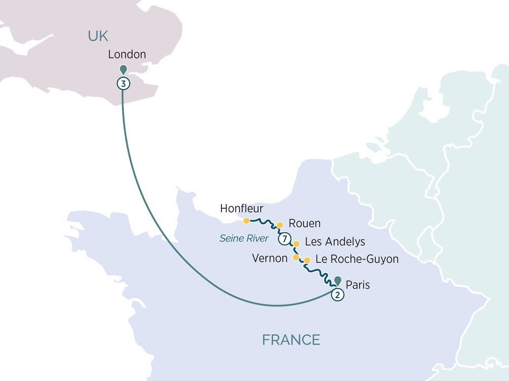 Transfer to your contemporary Star-Ship, Emerald Lumi. This evening, join your fellow guests for a welcome dinner on board. Later, your Star-Ship will depart Paris and cruise to Vernon during the night. (B/D)