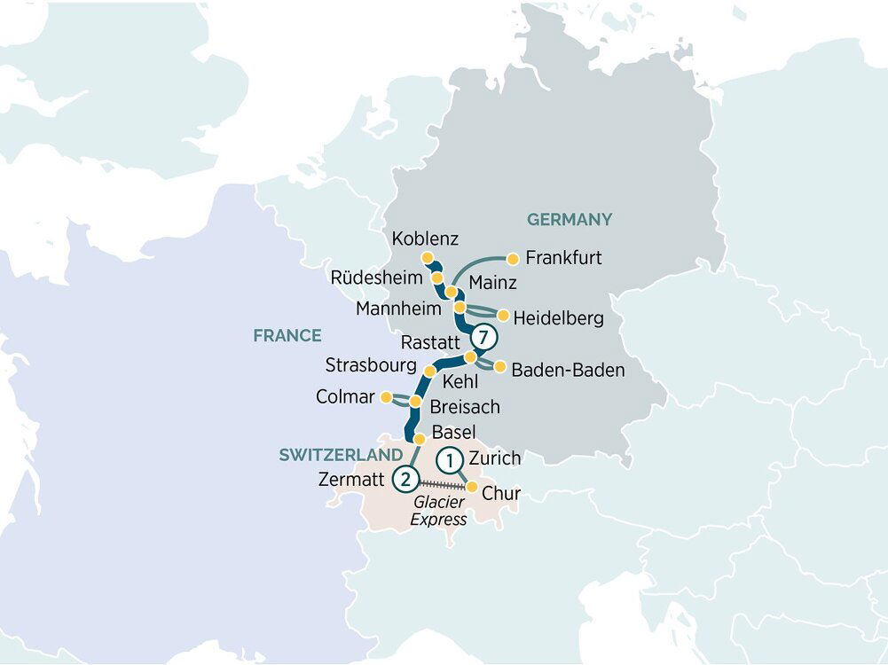 Bid farewell to Zermatt’s mountain landscapes as you are transferred to Basel, where your luxury river cruise awaits. En route, enjoy a short break in Montreux, known as the jewel of the Swiss Riviera, nestled on the shores of sparkling Lake Geneva and surrounded by palm trees and snowcapped peaks. Continuing onward, you’ll arrive in the vibrant city of Basel. Here, you’ll embark on your Emerald Star-Ship, where a warm welcome from the crew and fellow guests await. (B/D)