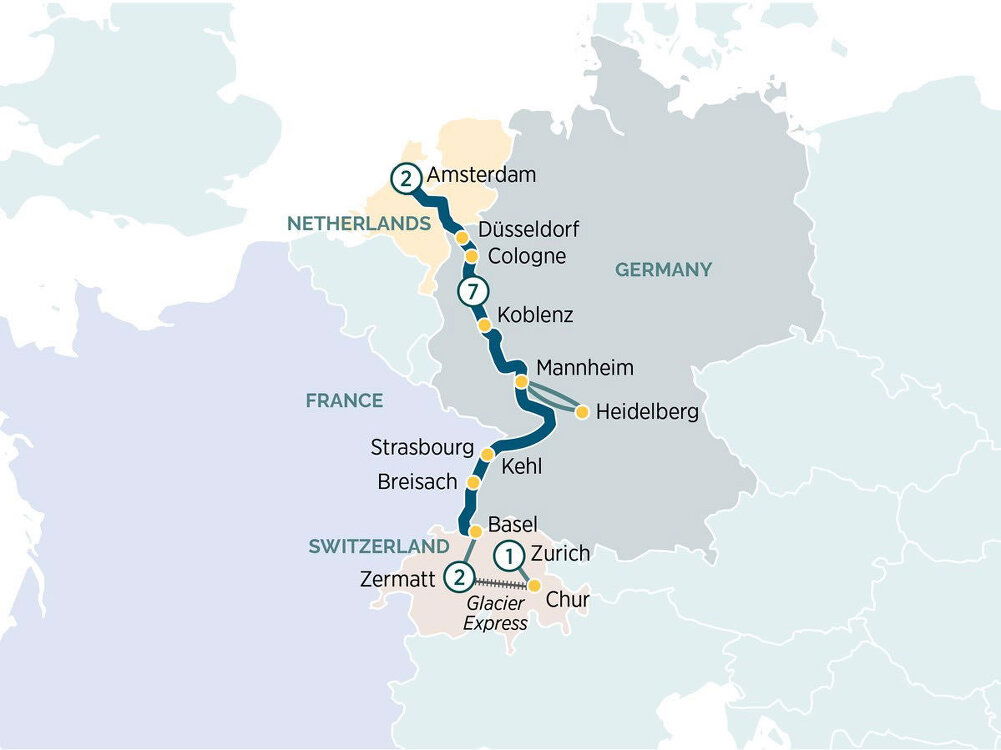 After breakfast, it is time to bid farewell to your fellow guests and transfer to the airport, taking with you cherished memories of the Rhine and Swiss mountain landscapes.