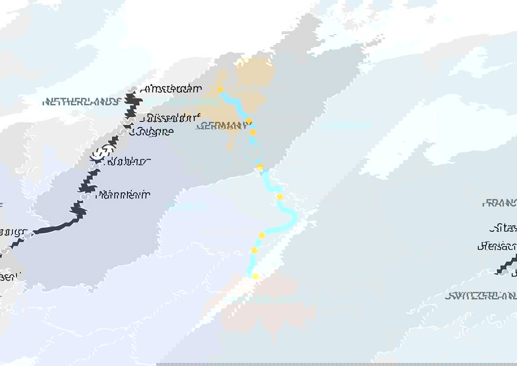 Once a Roman stronghold desired for its strategic value, Koblenz is now a city with a unique blend of historic and contemporary architecture. Today, join your local guide for an insightful walking tour of Koblenz, passing examples of architecture that survived the war years, including the Church of Our Lady. You will also have the chance to see the point at which two of Europe’s great rivers meet at the German Corner and Ehrenbreitstein Fortress, one of the largest preserved fortresses in Europe. Later, we'll cruise through the UNESCO World Heritage-listed Rhine Gorge, exemplifying the extraordinary beauty of an area that left the philosophers and artists of the German Romanticism movement entranced. (B/L/D)