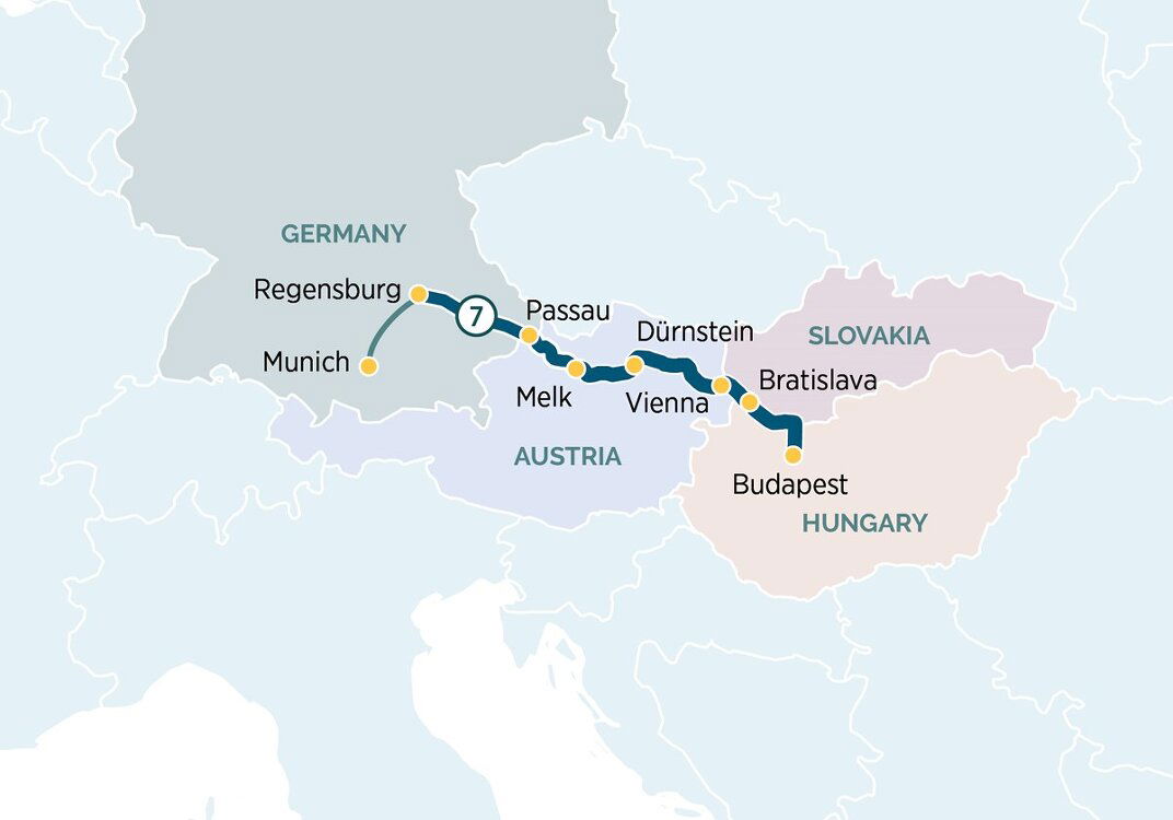 Explore the medieval centre of Regensburg with your insightful local guide. Stroll along the cobblestone streets, passing the patrician houses of the UNESCO World Heritage-listed Old Town, and stop by to sample traditional Bavarian sausages, a delicious local specialty. Alternatively, join a guided bike tour to the Walhalla monument, which towers high above the banks of the Danube. From here, you can admire a panoramic view of the river and surrounding scenic landscape. (B/L/D)
