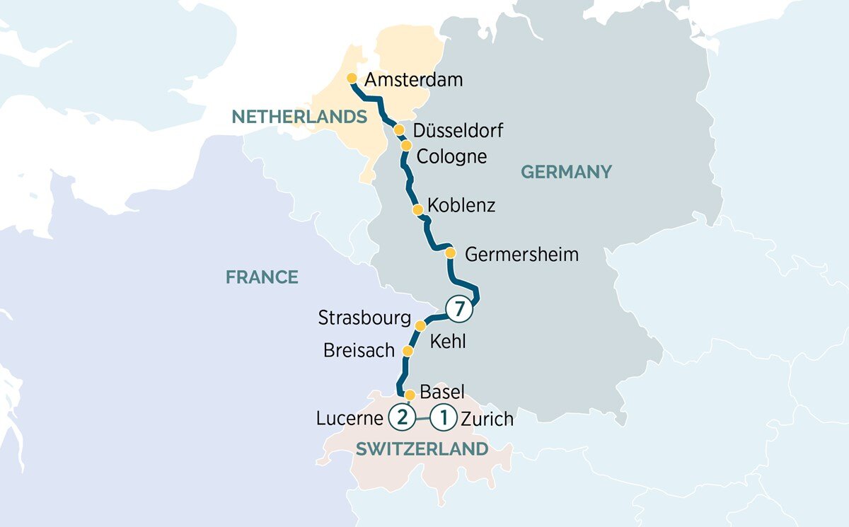 We’ll take you into the heart of Koblenz, an ancient city pulled from the pages of a German fairy tale. Enjoy the picturesque backdrop of vineyards and snow-topped mountain ranges as your local guide takes you through open cobbled squares and down narrow streets, passing façades adorned with boxes of spring-blooming flowers. You’ll also have the chance to see the point at which two of Europe’s great rivers meet at the German Corner and Ehrenbreitstein Fortress, one of the largest preserved fortresses in Europe. (B/L/D)