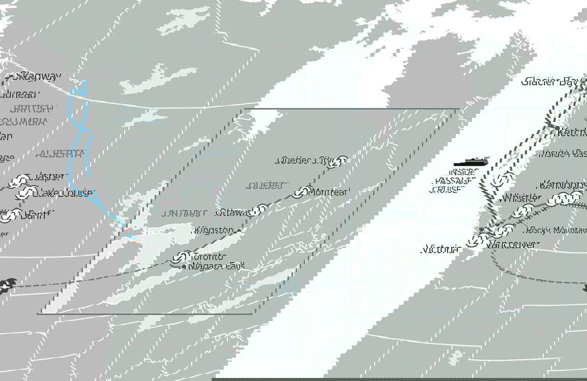 Welcome to Canada! You will be met at Vancouver International Airport and transferred to your hotel. This evening, meet your Tour Director and fellow travellers for a welcome dinner. (D)