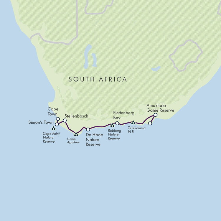 Our day begins with a final game drive in Amakhala before we head west to the official start of the Garden Route – Storms River in Tsitsikamma National Park. Getting its name from a local word meaning ‘place of abundant water' and encompassing land and sea, Tsitsikamma National Park is a diverse wilderness of lush forest, epic canyons and magnificent coastal views. In the park, we enjoy a walk in the forest and along boardwalks and suspension bridges. This is a great opportunity to encounter abundant birdlife, with sea, forest and scrubland species all present. Our accommodation is a short transfer away in the relaxed seaside town of Plettenberg Bay, where there are great restaurants close to our lodge for dinner. Stay: Christiana Lodge, Plettenberg Bay (four-star) (B/L).