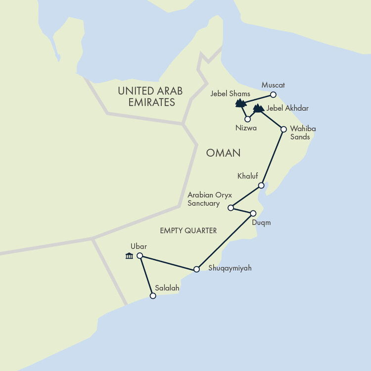 After breakfast, we continue our journey (five hours) to the Empty Quarter, the largest sand desert in the world, covering parts of Oman, Saudi Arabia, the UAE and Yemen. Our route takes us up the mountains to Marmul, an oil region, before heading west to Thumrait. We then drive north to Ubar, which we visit tomorrow, before arriving at our wild campsite in the Empty Quarter. Stay: Camping in the Empty Quarter (B/L/D).