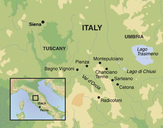 After a short transfer to Pienza take time to explore the town - it is one of the cheese capitals of Italy - and its beautiful medieval historic centre. Perhaps pick up a sandwich filled with porchetta or a slab of rich and creamy Pecorino. The ride takes you downhill to cross one of the stunning plains of the Val d'Orcia, and a short detour takes you to Roman Bagno Vignoni with its roman baths and sulphur springs. Follow a long straight Roman road then cross the valley and climb up and down into Chianciano.