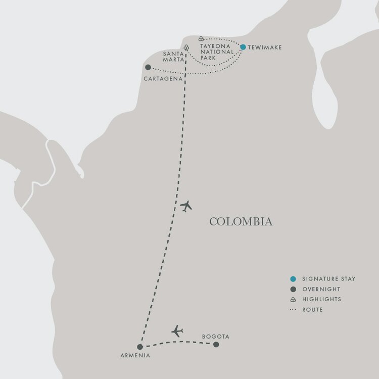 Bid farewell to the coffee region this morning and fly to Santa Marta, gateway to the tropical rainforests, sandy beaches, and vibrant coral reefs of Tayrona National Park. Signature Experience: Meet the guardians of the Sierra Nevada, starting with a 45-minute guided walk through the forest to Katanzama. Here, we're introduced to the Indigenous Arhuaco people, learning first-hand about their customs and traditions.