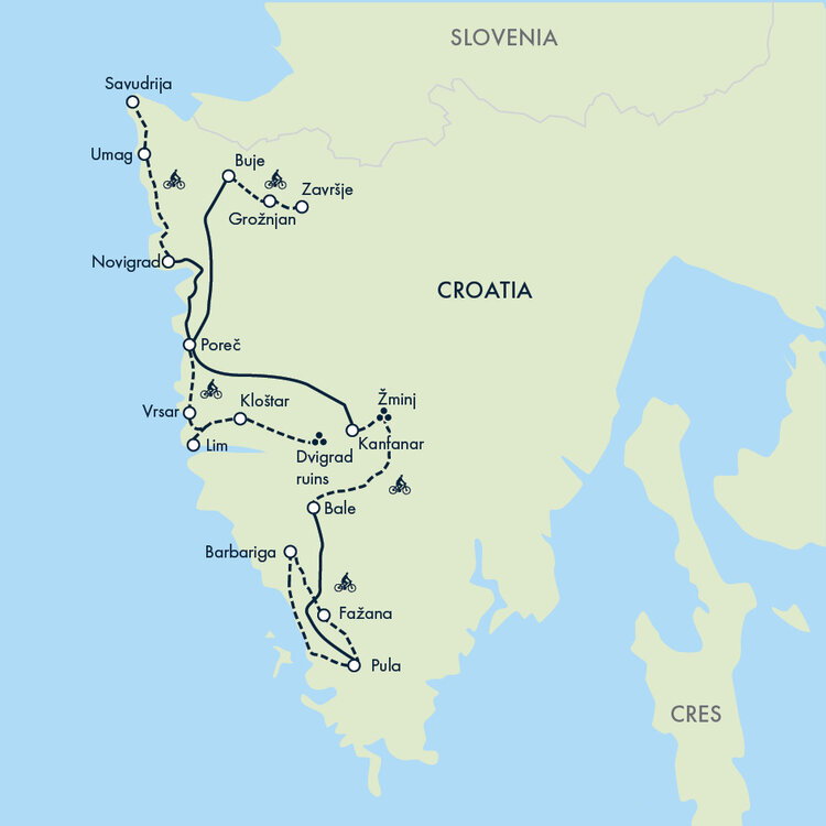 After a coffee break, we ride gravel roads through Kontija forest, which is dominated by European hornbeam trees, and local roads past vineyards and olive groves to our next break point, the village of Kloštar. Refreshed, we ride to the abandoned medieval town of Dvigrad. Explore the castle ruins, before completing the final stretch today at Lim Bay, where we catch our transfer (one hour) back to Poreč. Route: 50% quiet paved roads, 50% gravel roads Upgrade to a superior or a sea-view room today – speak to your sales representative for more details.