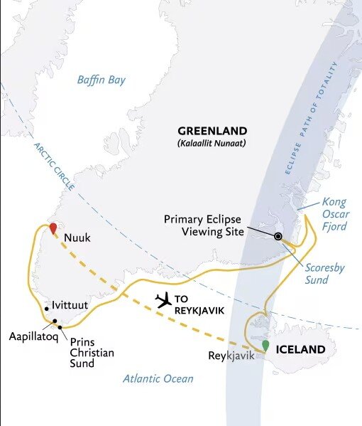 Our purpose-built vessel will cruise deep into Scoresby Sund, allowing guests to marvel at the overwhelming beauty of the world's largest fjord system and its vast icebergs. This area offers plenty of opportunities to explore during Zodiac cruises and onshore visits, and, if conditions allow, time to visit Ittoqqortoormiit, the most remote community in East Greenland. There will be a palpable sense of excitement in the air as anticipation builds for our much-awaited eclipse viewing. Behind the scenes, your Expedition Leader and the Ship Captain will work closely together, monitoring sea and ice conditions and meteorological forecasts—particularly cloud cover—to strategically position Ocean Explorer in the best location possible to maximize your views of the solar eclipse.