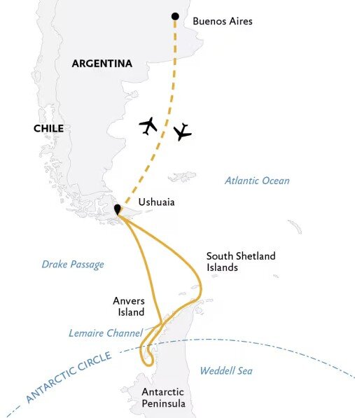 After visiting some of the region's iconic penguin colonies and glacial features, we continue south into Crystal Sound to cross the Antarctic Circle. Crystal Sound is known for its massive expanse of steep mountains that rise directly out of the sea. We hope to visit Detaille Island and, weather-permitting, fly into the mountains of the Antarctic Peninsula at the Antarctic Circle. Our goal is to visit the British Antarctic Survey's historical hut, and the adélie penguin colony of Detaillle Island. We also hope to Zodiac cruise in this area to see the colossal icebergs that formed from the glaciers fed by the snowfall in the coastal mountains of Antarctica.