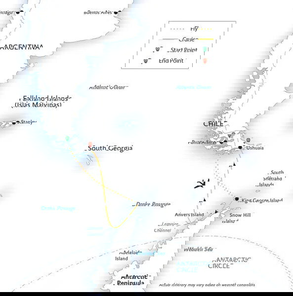 Today you board your chartered flight to Antarctica. The journey over the Drake Passage takes less than four hours, whereas our ship-based travelers take two days to make the journey by sea. Your first glimpse of Antarctica comes into view shortly before the aircraft descends towards King George Island –hope for clear skies so you can appreciate the vastness of this great continent! You have free time to photograph parts of the island and stretch your legs before joining the ship. Once aboard, you'll enjoy your first trip in a Zodiac and begin your exploration of the Antarctic region.