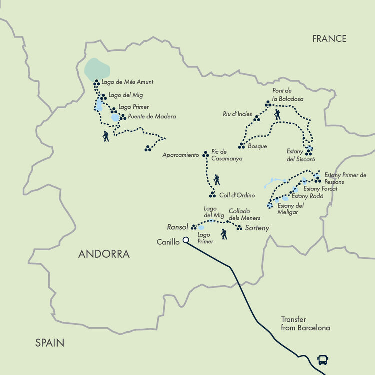 A 30-minute transfer brings us to Grau Roig. It may be a renowned ski resort, but it's the gateway to the Circ de Pessons for us, a glorious glacial amphitheatre dotted with a series of mountain lakes. A fitting finale to our week of hiking. We follow a circular route linking several of the lakes, surrounded by glorious Andorran peaks throughout. Maximum altitude: 8,504ft (2,592m) (B/L).