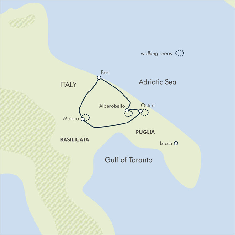 This morning, we drive to the stylish seaside town of Polignano a Mare, which is raised above the Adriatic on a limestone cliff. We first walk along the coast for beautiful sea views before exploring the historic centre, where alleys wind among white houses and lead to terraces with more views over the Adriatic.