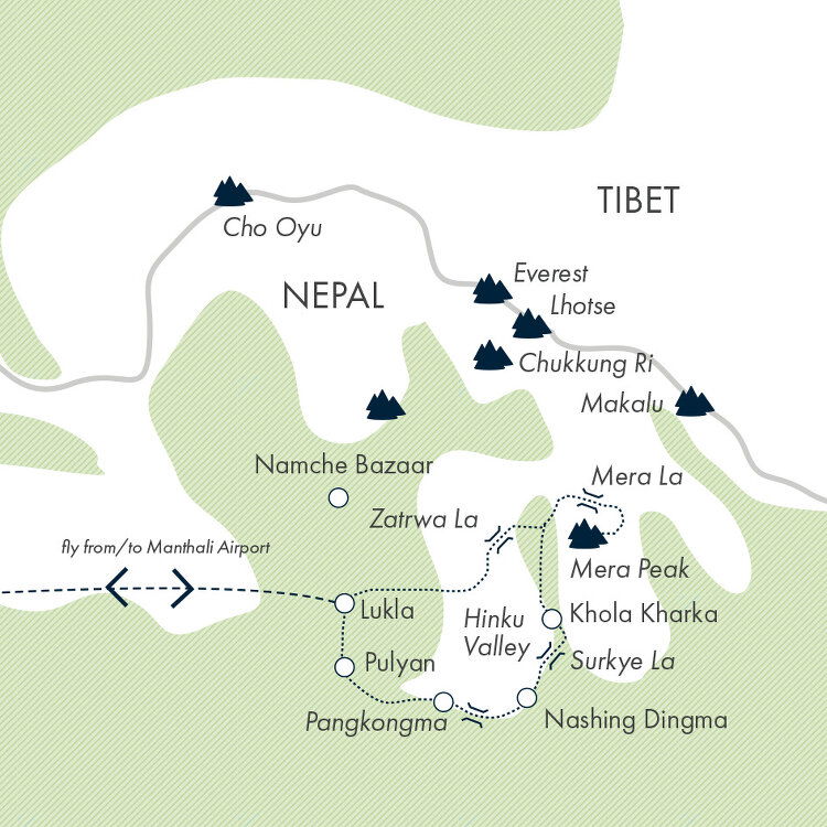 It's a hard day today as we begin our ascent of the Zatrwa La, the pass that brings us back to Lukla. Leaving Kote, a small rocky trail takes us down the Hinku Valley for a couple of hours. There are some very steep rocky steps both up and down. We finally leave the Hinku Khola river and begin a very steep climb through the forest. We have an early lunch at Toktar, a small cluster of teahouses in the forest. Through the trees, we can just spot the summit of Mera Peak now far away. After lunch, we continue climbing up through forest. The rhododendron trees give way to smaller bushes and the mountains begin to appear across the valley. Looking back on a clear day, we can see all three summits of Mera, Peak 41 and Naulekh. The higher we climb, the better the views, and we can trace much of the route we have trekked the past couple of weeks. Finally, we reach a few prayer flags; from here, the trail eases as we approach the lodge at Chetrabu, where we can enjoy views of Mera's vertical west face. Stay: Teahouse (sleeping altitude: 13,860ft/4,225m) (B).