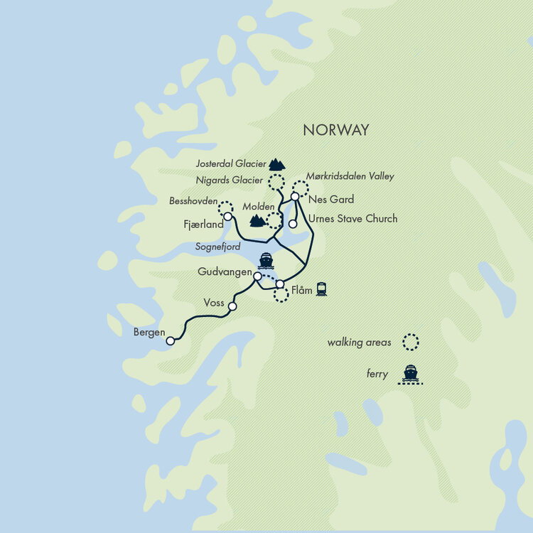 You've hiked through Norway's stunning fjords, ridden one of the most scenic railways in the world, and taken a boat onto a glacial lake, but now it's time to begin your return journey home. Alternatively, if you'd like to extend your adventure, speak to your sales representative to discuss our large range of extension options (B).