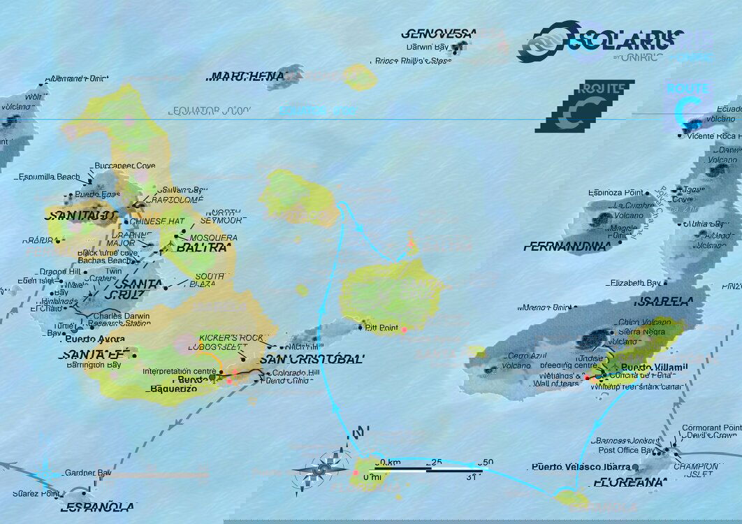 This is the only place in the southeastern archipelago where penguins reside. You can also climb the small basaltic cone of Baroness Lookout and enjoy the paradisiacal coastline views. This viewpoint was the favourite spot of one of Floreana's first settlers, the eccentric baroness and self-proclaimed Empress of the Galapagos, Eloisa von Wagner, who even built her house a few metres further back. There will be a long navigation at the end of the day, so we recommend you take medication for seasickness. Stay: Solaris (B/L/D).
