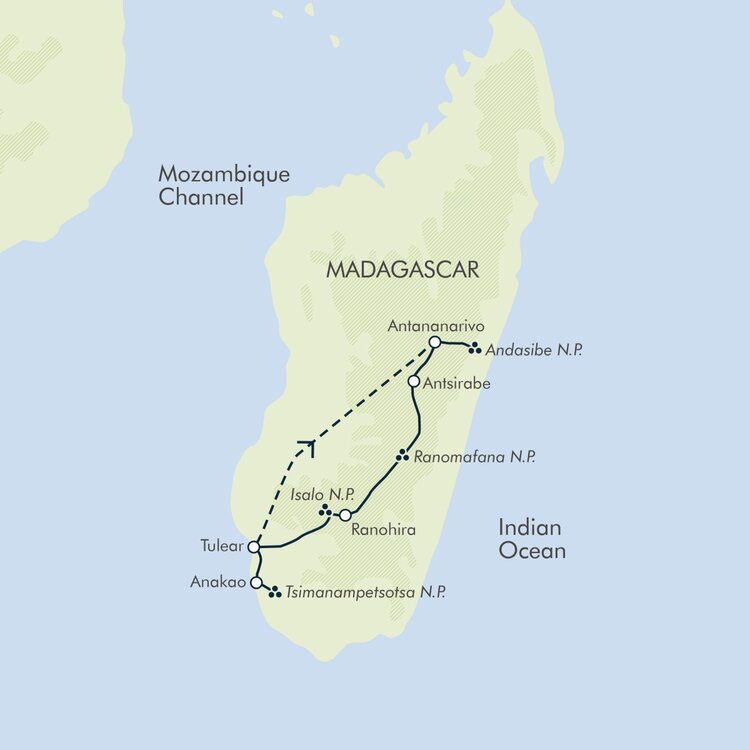 Today, we transfer to Tulear airport for our flight to Antananarivo. Depending on the flight schedule, you may have free time in the afternoon to explore Tana on your own. Stay: Belvedere Hotel (or similar) Day 13 - Fly to Antananarivo = 2 hours flight (B).