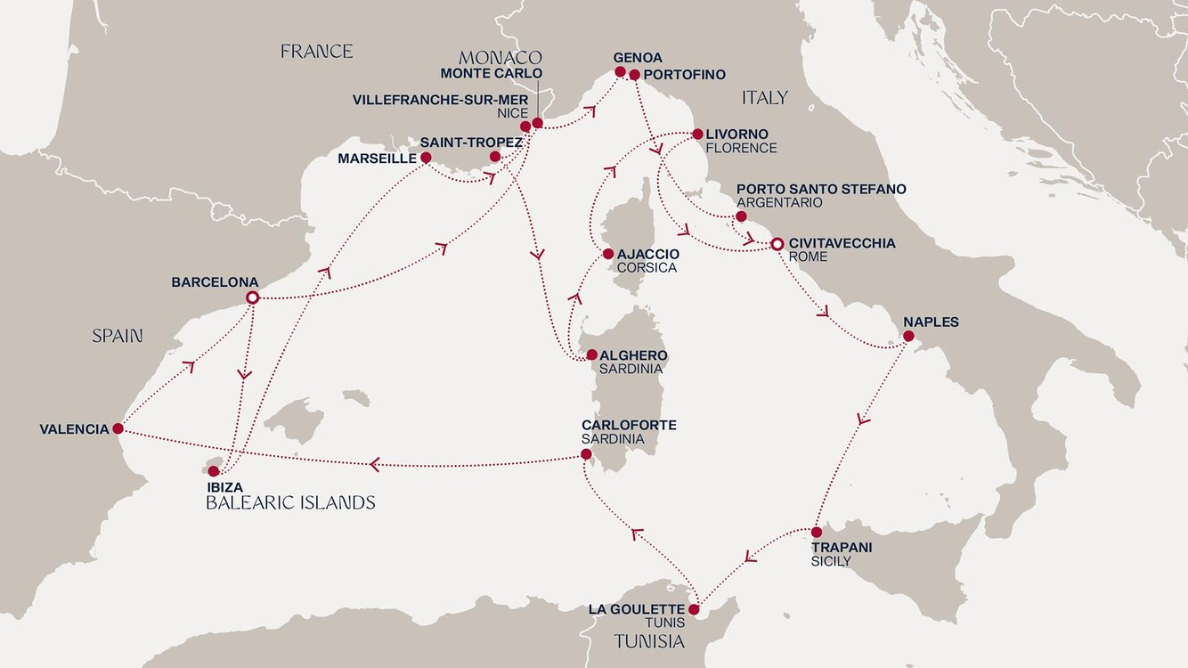 Encircled by dramatic ancient walls, which rise abruptly from deep-blue waters, Alghero's defences shelter one of Sardinia’s largest and most spectacular old towns. The uneven cobbled streets, rich history and Catalan flare alongside the nearby pristine beaches make Alghero a real highlight of Sardinia. Ships will anchor offshore and tender guests to shore.