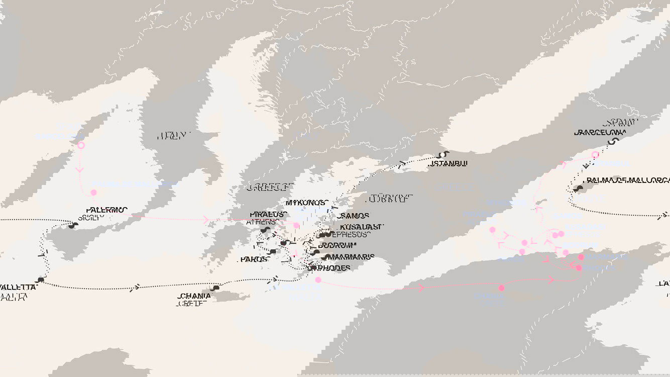 Part of the Cyclades archipelago, Paros is a radiant island boasting villages of whitewashed houses set off by azure doors and shutters. Along the quays of Parikia, its main town, you’ll see Byzantine churches and neoclassical buildings. Ships will dock or anchor offshore in Parikia.