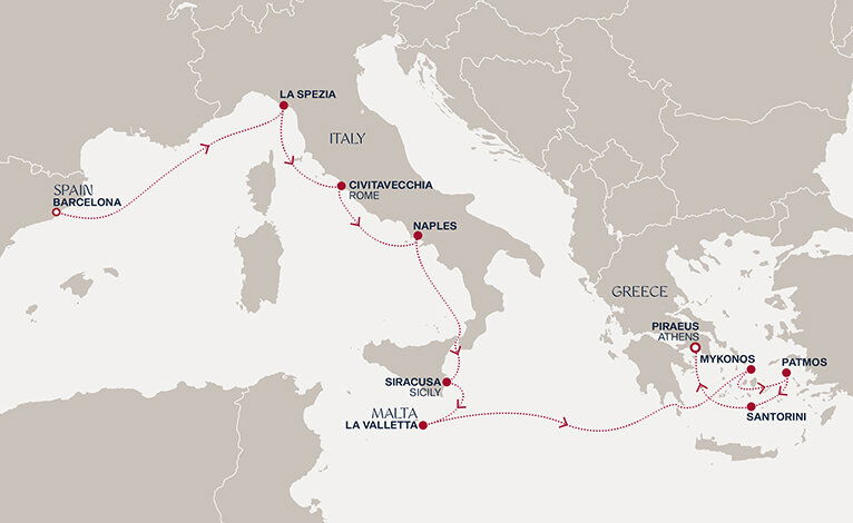 Dreamily sail into Santorini when others leave. Romantic, exuberant and pure; roam one of the world's most enchanting islands as you enjoy breathtaking scenery, rock-set whitewashed houses, paved paths, sugar white sand, black beaches and terracotta cliffs. Experience the many geological and architectural delights; blue-domed churches, an active volcano, excavate with experts and cover the caldera between cliff-hanging Oia and Fira. Glide through sapphire seas in a catamaran, taste local wine, eat freshly-caught seafood, break plates and shop elegant boutiques. Then settle in for a slow moonlit dinner high on a hilltop, just in time for the world-famous sunset.