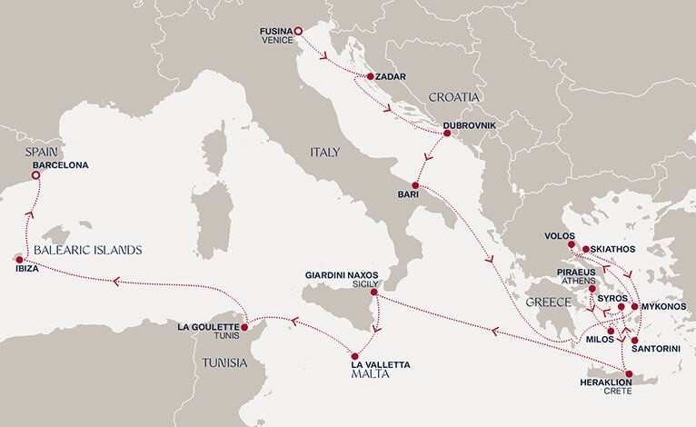 Dreamily sail into Santorini when others leave. Romantic, exuberant and pure; roam one of the world's most enchanting islands as you enjoy breathtaking scenery, rock-set whitewashed houses, paved paths, sugar white sand, black beaches and terracotta cliffs. Experience the many geological and architectural delights; blue-domed churches, an active volcano, excavate with experts and cover the caldera between cliff-hanging Oia and Fira. Glide through sapphire seas in a catamaran, taste local wine, eat freshly-caught seafood, break plates and shop elegant boutiques. Then settle in for a slow moonlit dinner high on a hilltop, just in time for the world-famous sunset.
