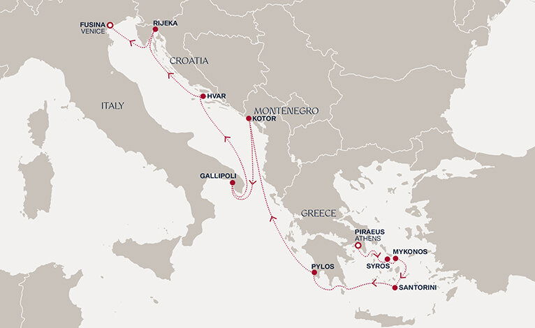 Dreamily sail into Santorini when others leave. Romantic, exuberant and pure; roam one of the world's most enchanting islands as you enjoy breathtaking scenery, rock-set whitewashed houses, paved paths, sugar white sand, black beaches and terracotta cliffs. Experience the many geological and architectural delights; blue-domed churches, an active volcano, excavate with experts and cover the caldera between cliff-hanging Oia and Fira. Glide through sapphire seas in a catamaran, taste local wine, eat freshly-caught seafood, break plates and shop elegant boutiques. Then settle in for a slow moonlit dinner high on a hilltop, just in time for the world-famous sunset.