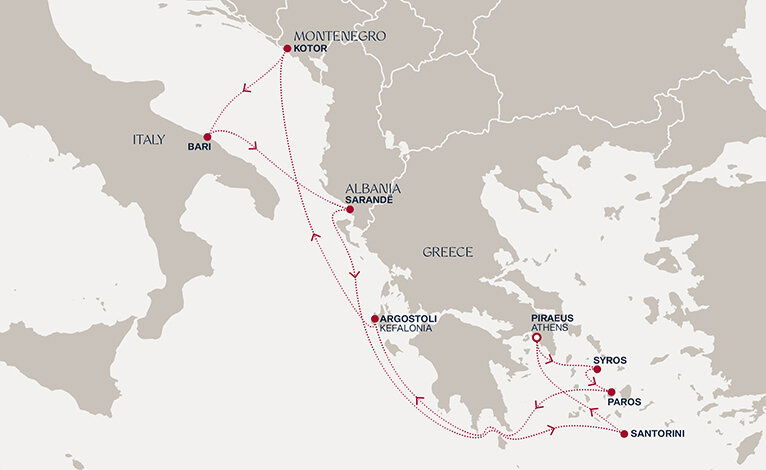 Dreamily sail into Santorini when others leave. Romantic, exuberant and pure; roam one of the world's most enchanting islands as you enjoy breathtaking scenery, rock-set whitewashed houses, paved paths, sugar white sand, black beaches and terracotta cliffs. Experience the many geological and architectural delights; blue-domed churches, an active volcano, excavate with experts and cover the caldera between cliff-hanging Oia and Fira. Glide through sapphire seas in a catamaran, taste local wine, eat freshly-caught seafood, break plates and shop elegant boutiques. Then settle in for a slow moonlit dinner high on a hilltop, just in time for the world-famous sunset.
