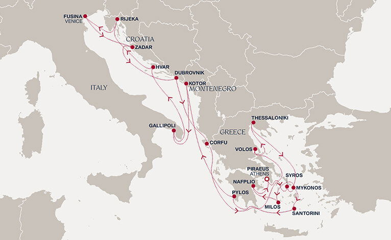 Dreamily sail into Santorini when others leave. Romantic, exuberant and pure; roam one of the world's most enchanting islands as you enjoy breathtaking scenery, rock-set whitewashed houses, paved paths, sugar white sand, black beaches and terracotta cliffs. Experience the many geological and architectural delights; blue-domed churches, an active volcano, excavate with experts and cover the caldera between cliff-hanging Oia and Fira. Glide through sapphire seas in a catamaran, taste local wine, eat freshly-caught seafood, break plates and shop elegant boutiques. Then settle in for a slow moonlit dinner high on a hilltop, just in time for the world-famous sunset.
