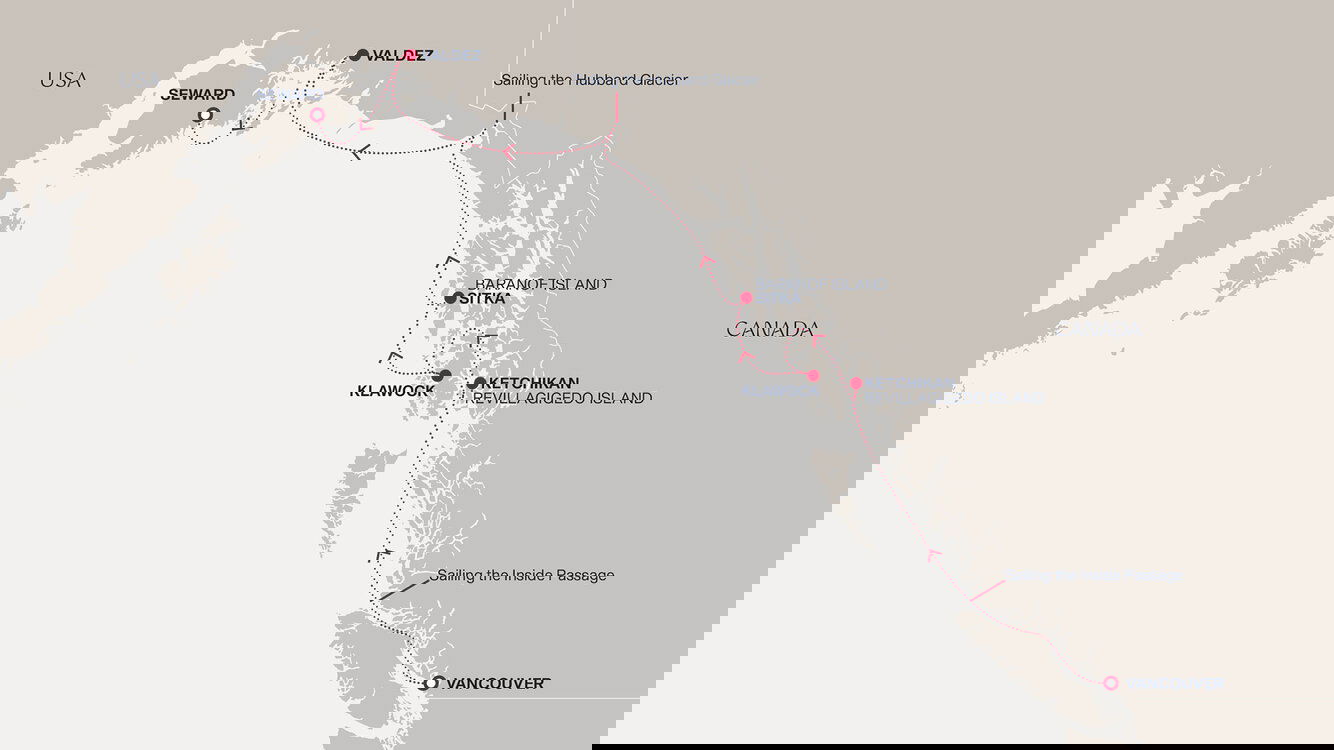 In Ketchikan, we step back into thousands years of history and discover a landscape that is alive beneath our feet and find moose and mountain goats, brown bears and black-tailed deer; a micro world that reminds us what it is to be wild and free. First steps lead to the picturesque Creek Street Historic District, where bridges cross creeks teeming with salmon during spawning season. Thrills go far beyond: soar in a seaplane to Misty Fjords National Monument, a seldom‑seen American national treasure with awe‑inspiring topography of sheer walls of granite plunging 3,000 feet into the fjords, lush forests of spruce, hemlock, and cedar clinging to snowcapped peaks of rugged grandeur. Scout some of the oldest and most beloved Totems of indigenous Tlingit and Haida people.
