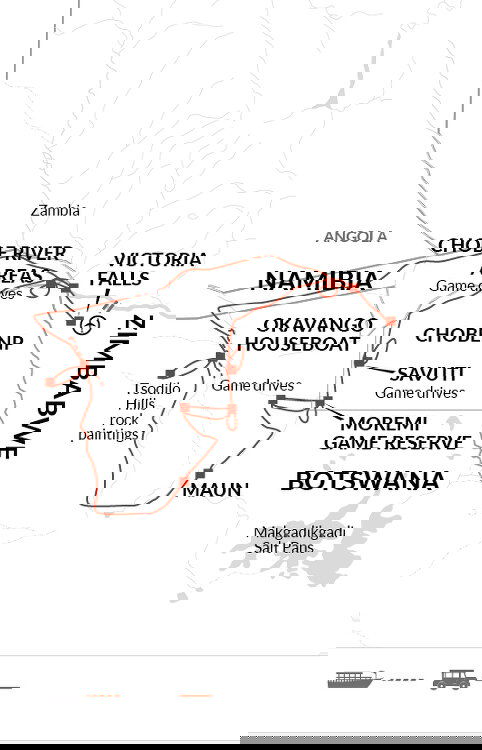 We'll have an early start this morning as we set off on the very long journey to Victoria Falls. Today's total journey time is approximately eleven hours (depending on time spent at the border crossings) including comfort breaks and a lunch break. The crossing point into Namibia is the Mohembo Border Post.