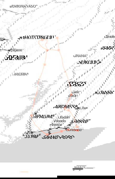 After breakfast, we'll cross the border back into Togo, where we'll continue for a short while before stopping in Aneho, a village of thatched houses with shrines and fetishes, and there may be an opportunity to watch a Voodoo ceremony. During such a ritual we will see traditional dancers falling into a deep trance at the hypnotic rhythm of drums. After the ceremony, we meet a traditional healer who treats the patients with voodoo rites and herbs.