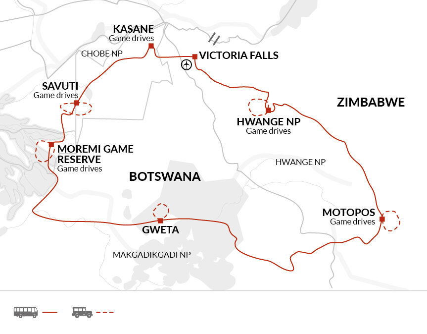 During our safaris, we'll travel in customised, open-sided land cruisers. The land cruisers are ideal for game viewing but can be a bit brisk and windy at times, so we recommend bringing layers for longer travel days. The roads through both Botswana and Zimbabwe vary in quality, so travel days can be slow and bumpy, but the scenery and wildlife more than make up for this.