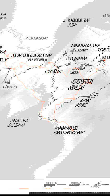 Leaving Tortuguero this morning, we'll head back to La Pavona Pier by boat, a journey of around two hours. From here, we'll drive on to Guapiles, lying in the heart of the country's banana-growing region, where we'll stop for lunch before driving on to the starting point of our cycling adventure close to Sarapiqui.