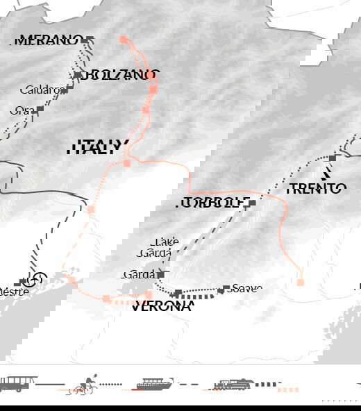 This morning, we'll continue our journey by bike from Bolzano to the impressive setting of Lake Caldaro on a longer ride. From the crystal-clear waters of Lake Caldaro, our ride follows the beautiful 'Strada del Vino' (wine road) leading us through numerous wine-producing villages - along the way, we'll stop at a vineyard for an optional wine tasting. We'll then descend into the Adige Valley and enter a bike path that takes you all the way to Trento. As we pedal, we might make a stop at one of the 'Bici Grills' (cyclists bar) and visit century-old villages such as Egna and Salorno.