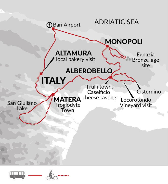 Our route leads us through beautiful scenery of ochre-coloured fields dotted with gnarly olive trees and trulli of all kinds and sizes. We'll cycle along a panoramic coastal road that is a natural balcony overlooking the beautiful blue waters of the Adriatic. We'll descend on winding roads, feeling the sea air to arrive at the town of Conversano. The coastal planes are cultivated with a variety of crops and dotted with elegant 'masserie' farmsteads. We'll cycle on to reach Monopoli - a bustling fishing town with splendid white-washed houses, narrow alleyways and our charming accommodation positioned in the heart of the old town.