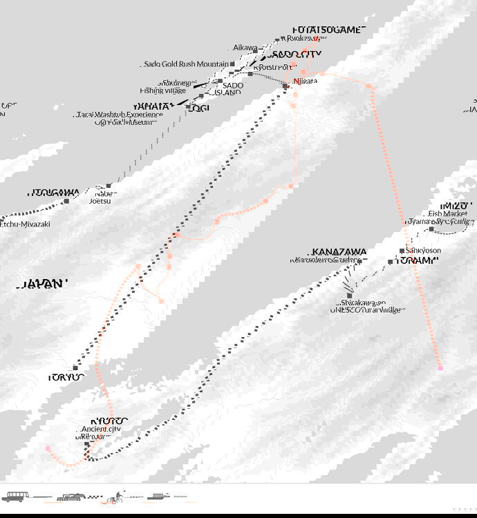 We then start riding on the coastal roads making our way around the island to Yahata, near the central plains. We then head the short distance to Sado City to our hotel for tonight. Please note that we return to this hotel on day 10 and it will be possible to store any luggage here over this period.