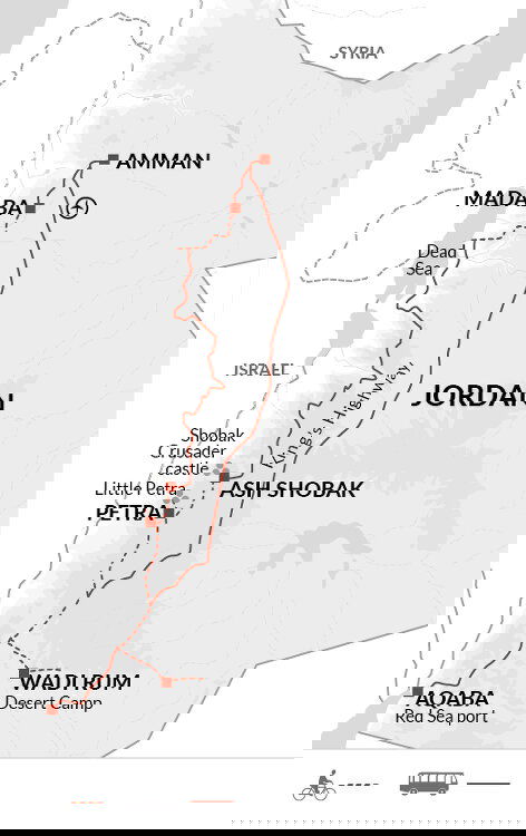 Today, we'll return to the King's Highway and pedal south, traversing upland roads before freewheeling down to the southern desert. We'll enjoy a picnic lunch with views over Arava and Israel beyond before cycling along the Old Desert Highway. Finally, we'll swap our bikes for our bus to journey onwards into Wadi Rum.