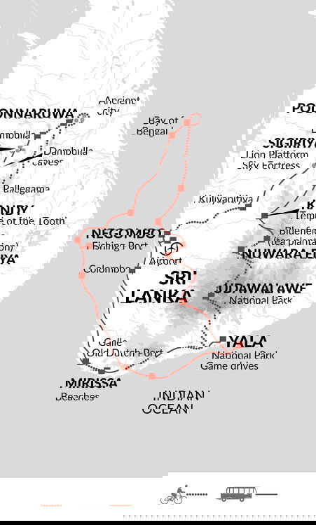 Leaving after breakfast this morning, we'll drive for 30 minutes to Dankotuwa. From here, we begin our morning's cycle ride through small backroads, gravel or dirt roads (15 kilometres/9.3 miles) and lovely forest to the outskirts of Kuliyapitya. Please note that the road surface for today's ride is in a poor state of repair. Arriving in Kuliyapitya, we'll then transfer to Dambulla by bus (a two-and-a-half-hour journey) to visit the UNESCO World Heritage Site. We'll break our journey with a lunch stop in Kurunegala. Dambulla has a great series of caves which hide an incredible collection of temples, Buddhist images and Hindu sculptures that date back to the 1st century BC. After our visit, we'll continue to our hotel in Sigiriya by bus (a 30-minute journey).