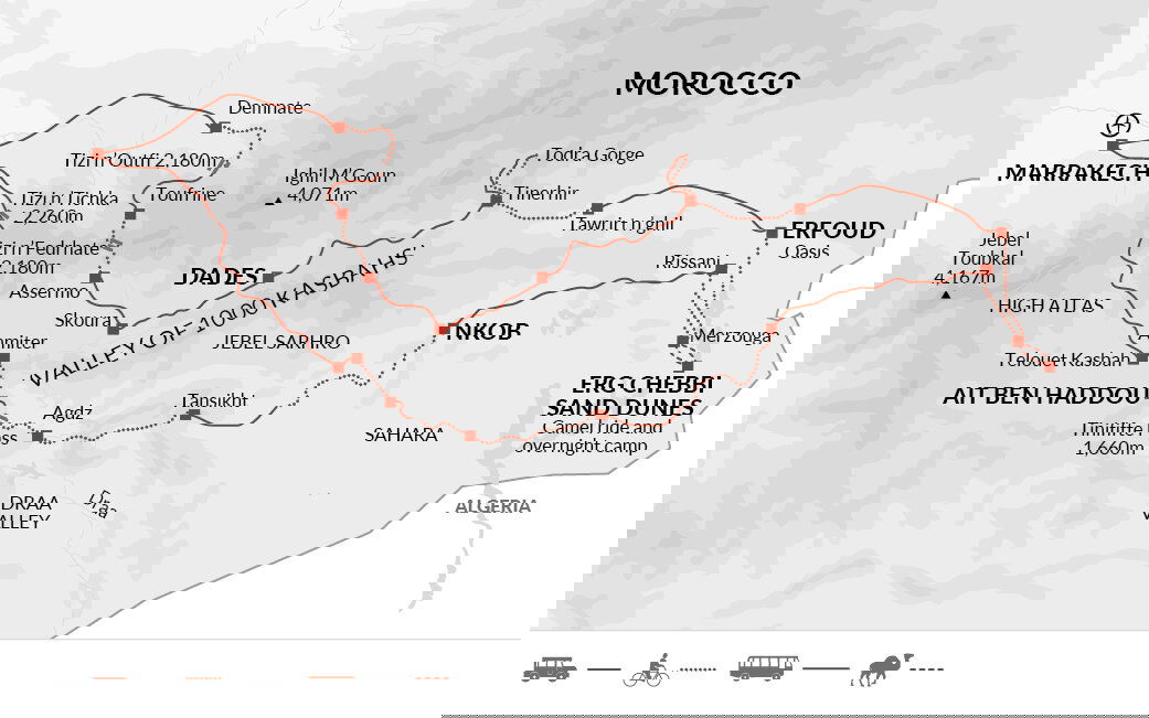 After an early breakfast, we'll drive into the High Atlas to the Tizi n'Fedrhate Pass, around two hours away, along the former caravan route to El Kelaa des M\ Gouna. Known as the 'town of the roses\ , El Kelaa des M\ Gouna is blanketed by scented blossoms each spring. These are harvested each May in the Festival of the Roses, before being processed into rosewater which is then sold throughout the Islamic world. From the high pass, we'll start our cycle down into the northern foothills of the Atlas Mountains. Amid the silence of the mountain valleys, we'll pass by local Berber communities at work on their farms, producing olives, figs and wheat. We'll eventually catch up to our bus, where we'll board to travel back to Marrakech, around two hours away.
