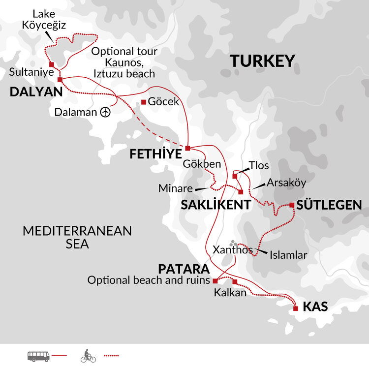 After lunch, we'll carry on pedalling downhill to the UNESCO World Heritage Site of Xanthos. This once proud capital of Lycia stood up to both the Persian and Roman armies and was tragically defeated both times. While the survivors chose to kill themselves rather than be enslaved, Xanthos flourished under the Persians and the Romans and Lycian artwork from the period is on display here in situ and some of the finest examples can be found in the British Museum in London. We'll visit the site before driving to our hotel in Patara, from where we can explore the Roman ruins (which also happens to be the birthplace of Saint Nicholas - better known as Father Christmas) and have time to relax on the golden beach.