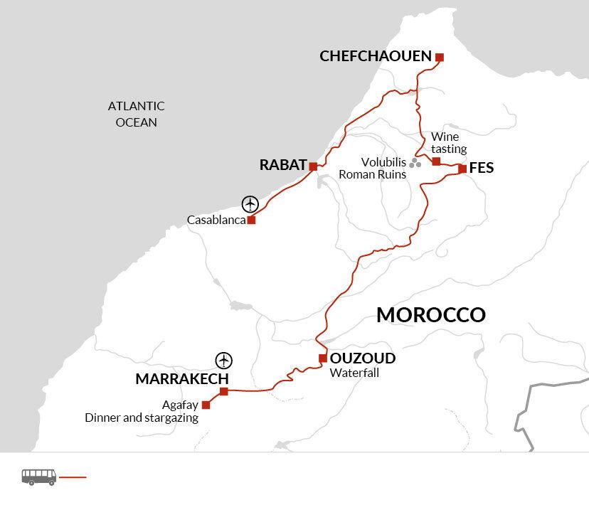 If you'd like an airport transfer today, you'll need to arrive into Casablanca Mohammed V International Airport (CMN) or Rabat Airport (RBA). As part of our Upgraded range, we also offer a complimentary transfer to those who have made pre-tour accommodation arrangements through Explore, regardless of your arrival day, provided we receive your flight details no later than 14 days prior to departure. The journey from the airport to our hotel is around 90 minutes.