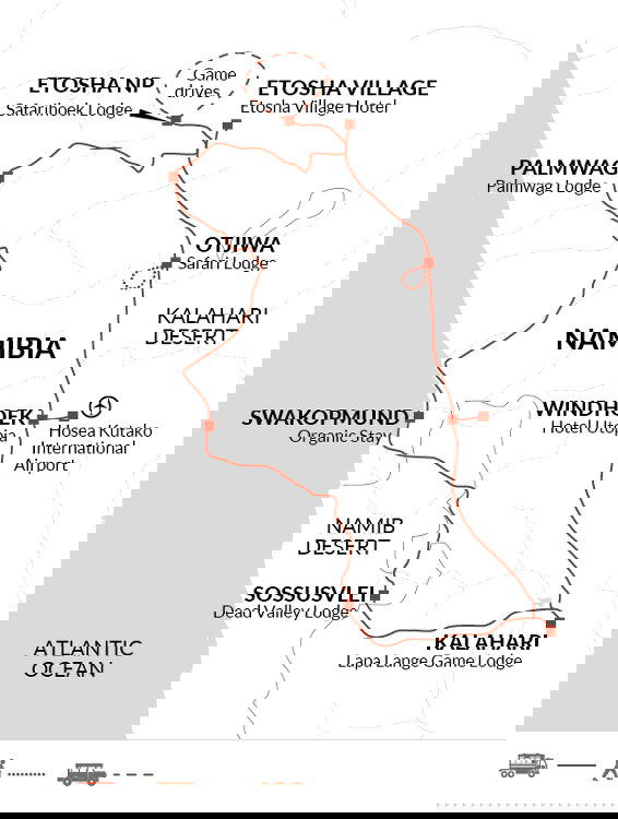 There are a number of optional activities available today which can be arranged locally with your tour leader, including a 4x4 desert adventure and a half-day dolphin cruise in Walvis Bay. Please see 'Optional activities' under Budgeting and packing below for more information. Stay: Organic stay (or similar) (Premium) (B)