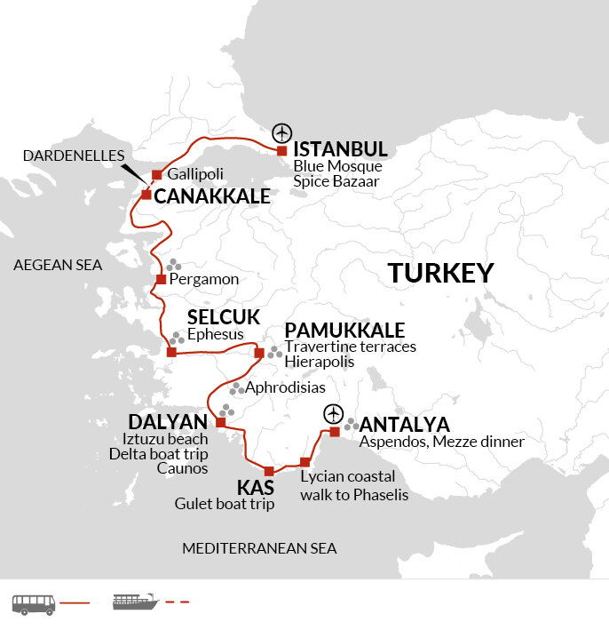 Our tour starts in Antalya, Turkey's main gateway to the Mediterranean. This lively city on the Turquoise Coast makes a perfect starting point for our journey.