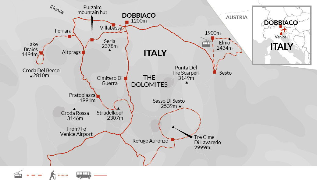 We'll take the bus to the Auronzo hut at 2,320 metres, just below the famed UNESCO site of the Tre Cime de Lavaredo. From here, we'll take a quieter path to the most impressive north faces of the Tre Cime and pass the Langalm hut before following another less well-known path to reach the Locatelli hut and a picnic spot near the lake. After lunch, we'll take a small path, looping around Torre di Toblin and have some time to explore various Austrian WWI defences. We'll return to the Auronzo hut via the south faces of the Tre Cime and a complete loop of the most iconic mountains in the Dolomites. From here, we'll return to Dobbiaco via the shuttle bus service.
