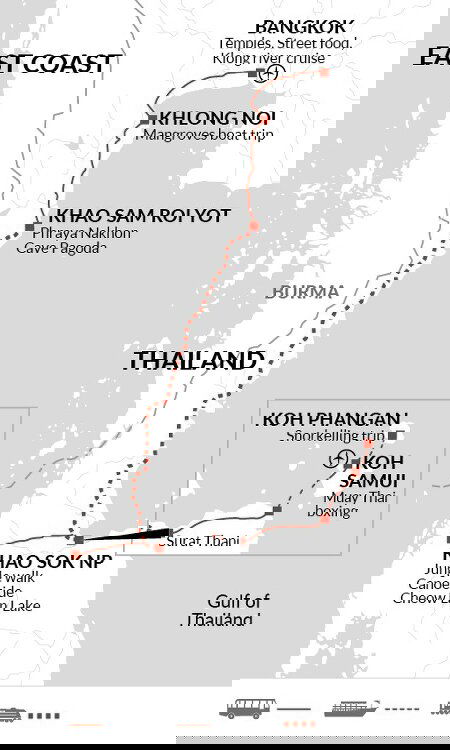 Start your day with a departure from Prachuap Khiri Khan province, heading to Pranburi train station to catch the train south, a journey of around five hours. After arriving in Surat Thani, we travel in our bus towards Khao Sok National Park, arriving at our hotel around sunset. Although it's a long travel day, the chance to observe local life and take in scenic views makes the journey worthwhile.