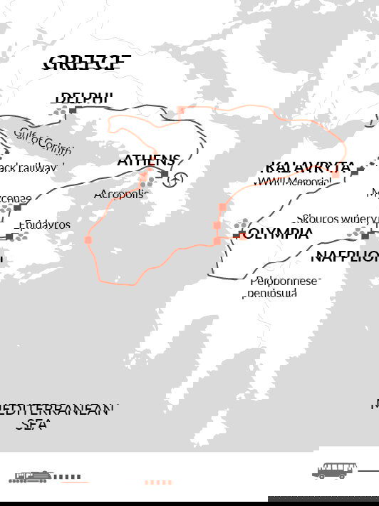 Continuing our journey, we'll have a quick stop in the beautiful town of Nafpaktos, known for the Lepanto battle. Next, we'll cross the impressive Rion-Antirion Bridge, that spans the Gulf of Corinth, into the Peloponnese peninsular and onto Diakofto, where we'll board the historic rack railway to Kalavryta. Travelling across the dramatic Vouraikos Gorge through tunnels, over heady ravines and past rushing waterfalls, it's a train ride to remember.