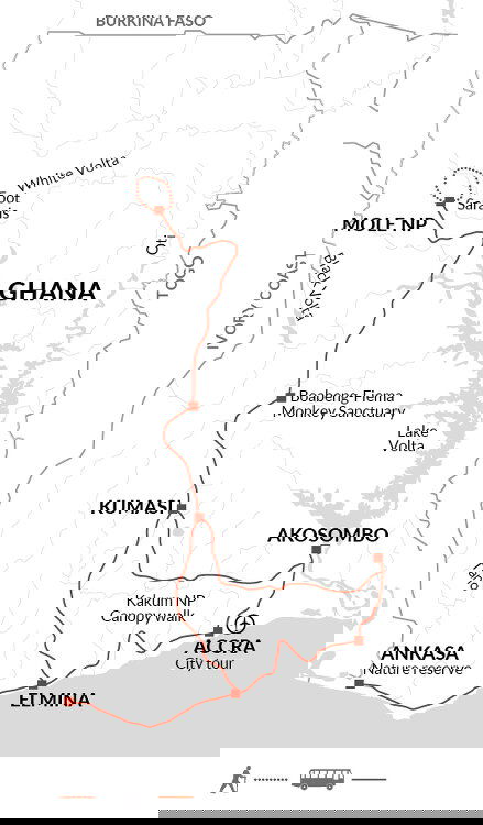 There are no other activities planned today, so you're free to arrive in Accra at any time. If you'd like an airport transfer today, you'll need to arrive into Kotoka International Airport (ACC), which is around a 30-minute drive from the city centre. Due to a number of flights arriving into Accra later in the evening and early morning, our welcome meeting will take place on the morning of day two.