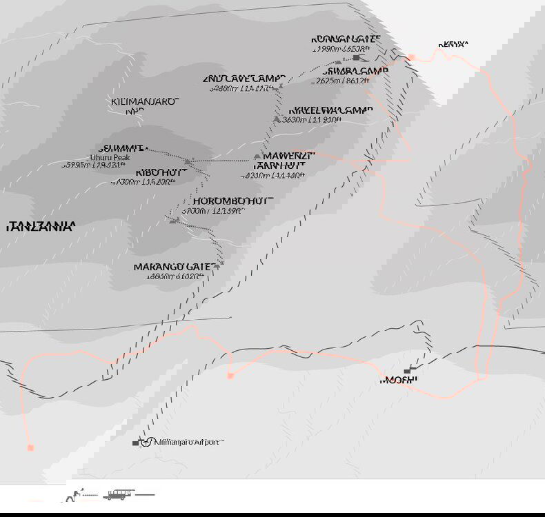 This morning, we'll drive to the village of Nalemoru, located at an altitude of 1,990 metres/6,529 feet near the Kenyan border (a three-hour drive), the starting point of the Rongai route.