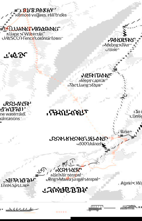 This morning, we take a boat back to the mainland before starting our drive toward Dom Kralor at the Trapeang Kreal border crossing. After clearing immigration, we arrive in Stung Treng on the Cambodian side, where we will switch vehicles.