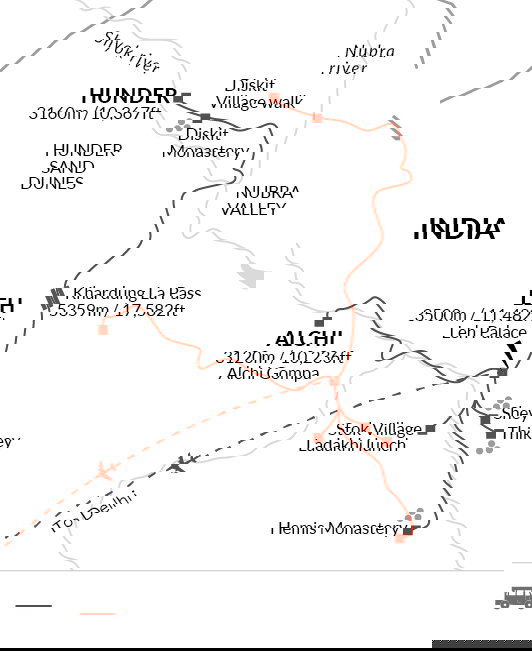 We'll have an early breakfast before setting out on the drive to Nubra Valley, crossing the famous Khardung La Pass, one of the highest motorable roads in the world at 5, 359 metres/18,379 feet. The pass was a major gateway to central Ladakh during the Silk Route period, so we will get a chance to see the ancient trade route on our way to Nubra.